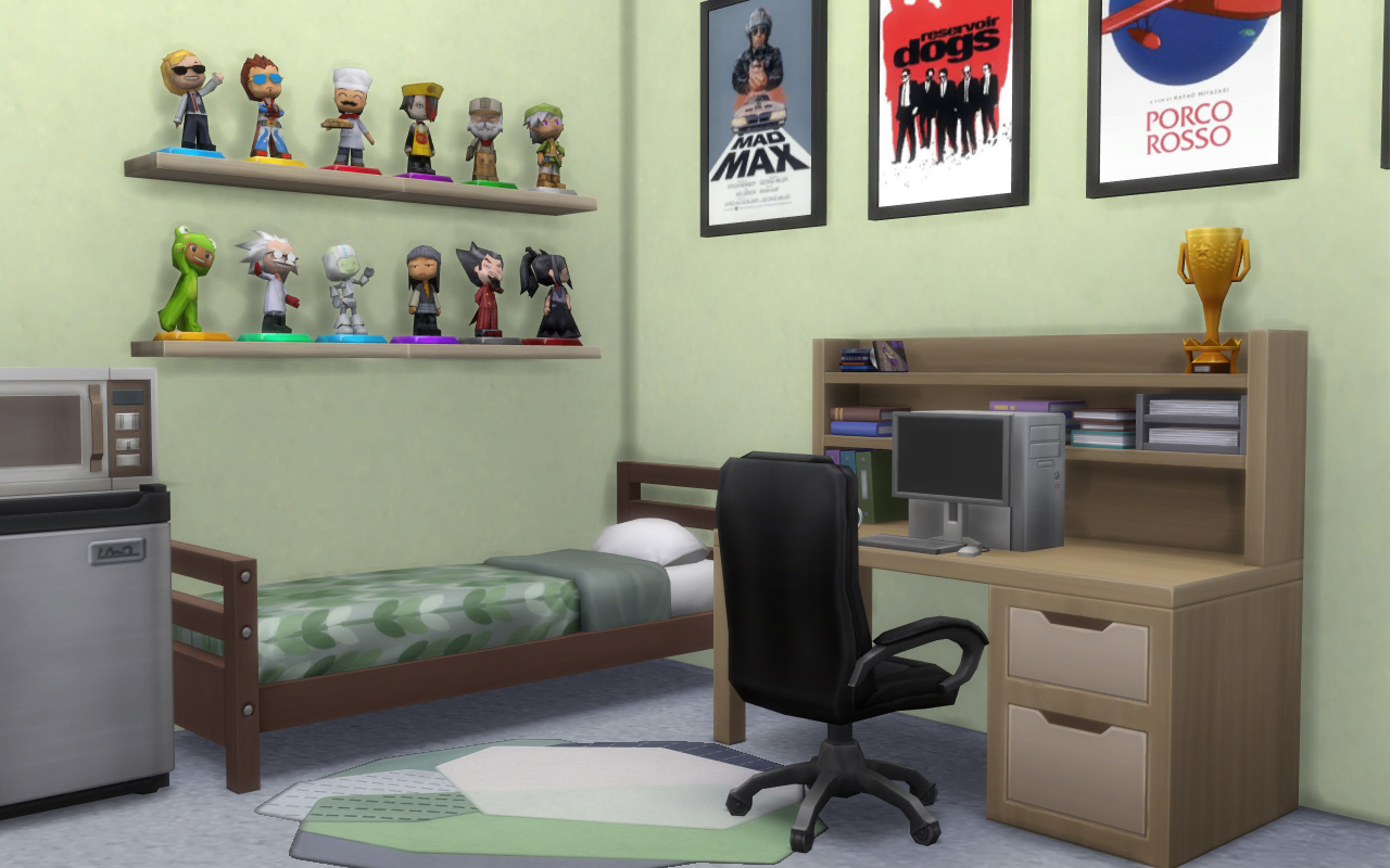 Button to go back a room Desktop computer Gold trophy cup Stack of discs Mini fridge Top wall shelf Bottom wall shelf Bottom drawer of desk